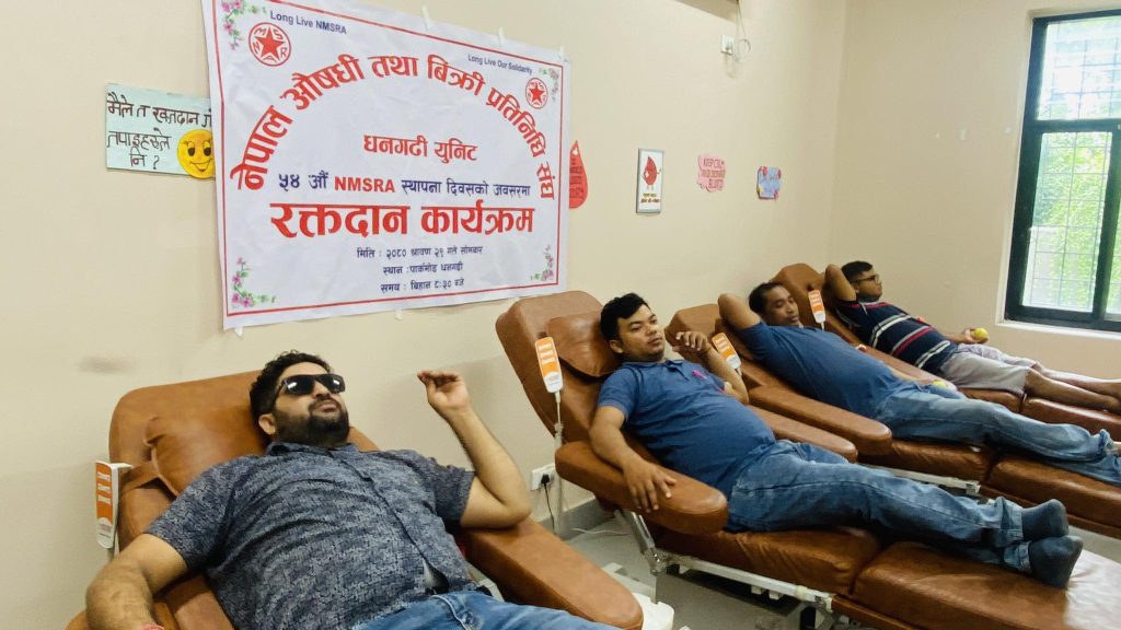 नेपाल औषधि तथा बिकृ प्रतिनिधि सङ्घ ( NMSRA ) धनगढि युनिट ले नेपाल रेडक्रस सोसाईटिको भवनमा बृहत रक्तदान कार्यक्रमको आयोजना गरेर आफ्नो ५४ औ स्थापना दिवस मनाएको छ।