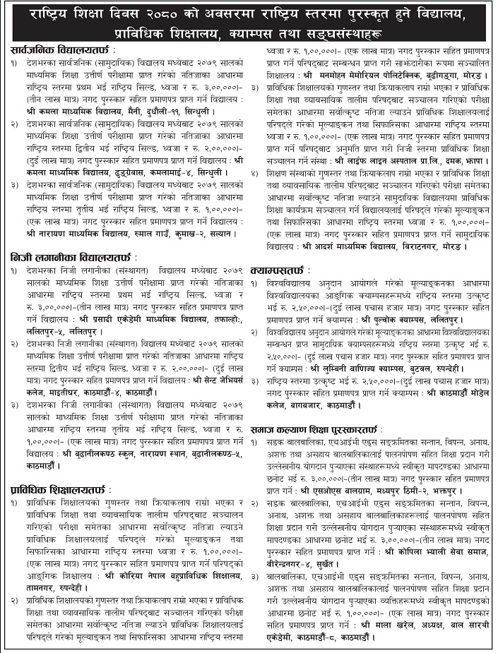 शिक्षा, विज्ञान तथा प्रविधि मन्त्रालयले राष्ट्रिय शिक्षा दिवसको अवसरमा पुरस्कृत हुने विद्यालय, प्राविधिक शिक्षालय, क्याम्पस तथा सङ्घ संस्थाको नामावली सार्वजनिक गरेको छ ।