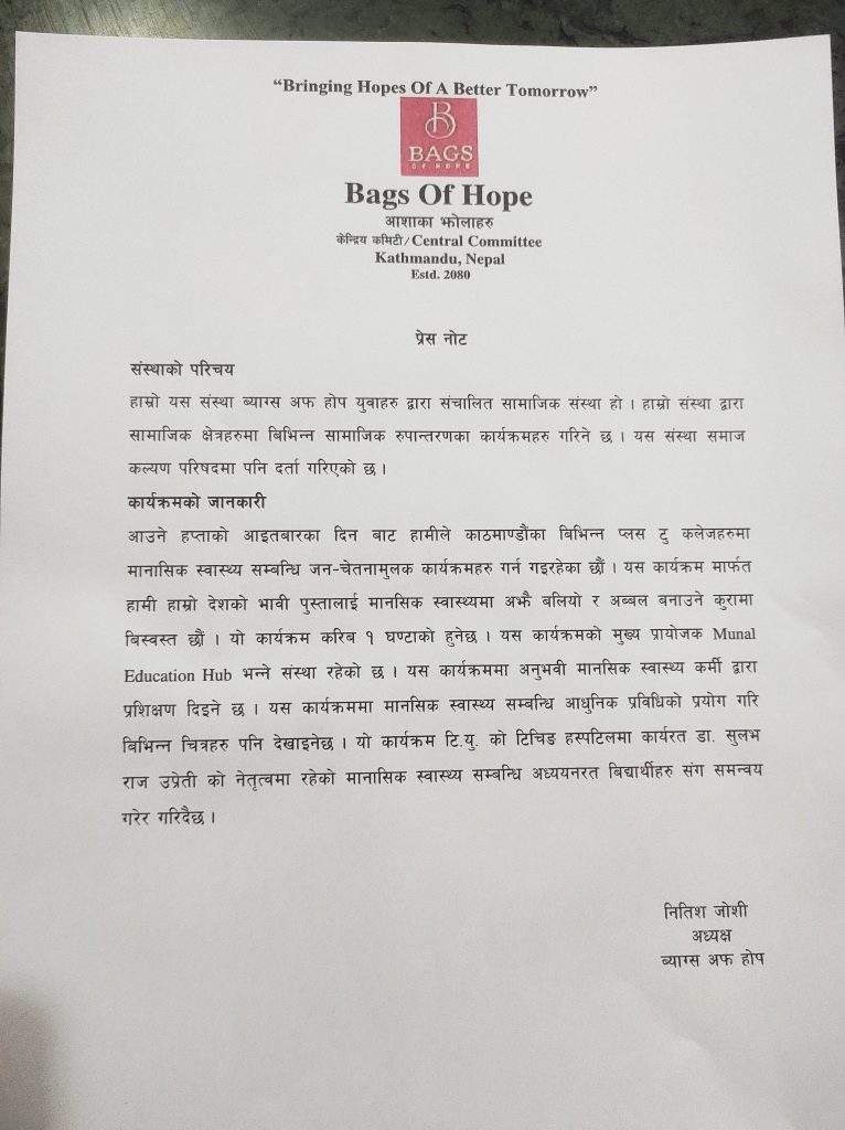 काठमाडौं । ब्याग्स अफ होप नामक संस्थाले काठमाडौंका विभिन्न प्लस टु कलेजहरुमा मानसिक स्वास्थ्यसम्बन्धी जनचेतनामूलक कार्यक्रम गर्ने भएको छ ।