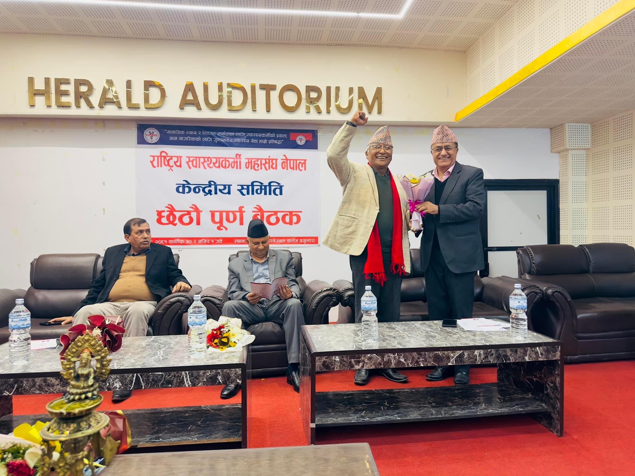 काठमाडौँ, २ मंसिर । राष्ट्रिय स्वास्थ्यकर्मी महासंघ, नेपालले आफ्नो पाँचौं राष्ट्रिय महाधिवेशन आगामी चैत महिना भित्र सम्पन्न गर्ने निर्णय गरेको छ । महासंघका अध्यक्ष डा झलक गौतमको अध्यक्षतामा शनिबार राजधानीमा सम्पन्न महासंघको छैटौ पूर्ण बैठकले उक्त निर्णय गरेको हो ।