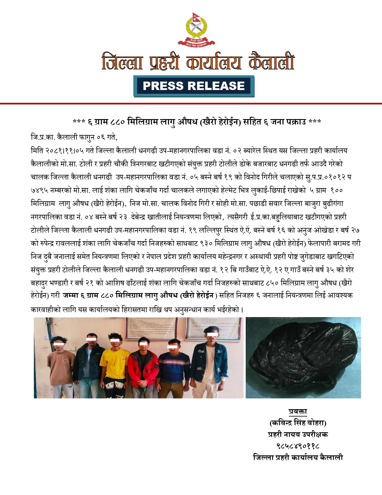 मिति २०८१।१०।५ गते, कैलालीको धनगढी उप-महानगरपालिका–२ स्थित एभरेष्ट सेभन गेष्ट हाउस नजिकै शंकास्पद गतिविधि भइरहेको भन्ने सूचनाका आधारमा जिल्ला प्रहरी कार्यालय कैलालीको विशेष टोलीले निगरानी बढाएको थियो। उक्त टोलीले धनगढी उप-महानगरपालिका–४ का ३१ वर्षीय एक पुरुषलाई खानतलासी गर्दा उनको साथबाट २०० मिलिग्राम खैरो हिरोइन बरामद गरिएको थियो।