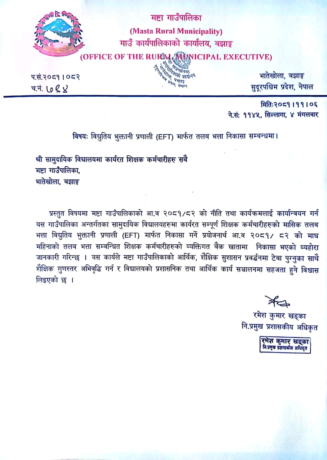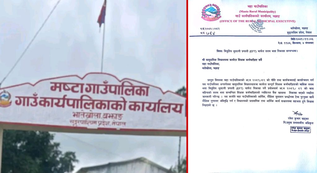 बझाङ : मष्टा गाउँपालिका, बझाङले सामुदायिक विद्यालयमा कार्यरत शिक्षक तथा कर्मचारीहरूको तलब भुक्तानी प्रक्रियालाई आधुनिक बनाउँदै विद्युतिय भुक्तानी प्रणाली (EFT) लागू गर्ने निर्णय गरेको छ। यो व्यवस्था गाउँपालिकाको आ.व. २०८१/८२ को नीति तथा कार्यक्रमअनुसार सञ्चालनमा ल्याइएको हो।