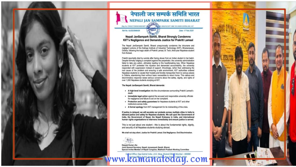 बेंगलोर – भारतको भुवनेश्वर,ओडिसा स्थित कलिङ्गा इन्स्टिट्यूट अफ इन्डस्ट्रीयल टेक्नोलोजी (केआईआईटी) बिश्वबिद्यालयको होस्टलमा नेपाली बिधार्थी प्रकृति लम्सालको संकास्पद मृत्यु भयको घटना र त्यसपछि नेपाली बिधार्थीलाई होस्टलबाट बलपूर्वक बाध्य र अपमान गर्दै घर जानलाई निष्कासित गरेको अमानवीय घटनाको घोर भत्सना गर्नको लागी बेंगलोरको फ्रिडम पार्कमा शान्तिपूर्ण बिरोध प्रर्दशन गर्ने नेपाली जनसम्पर्क समिति भारत तथा नेपाली कांग्रेस मधेश प्रदेश कार्यसमिति आमन्त्रित सदस्य दिपक कुमार झा ले एक बिज्ञेप्ति निकाल्दै जानकारी दिएका छन।