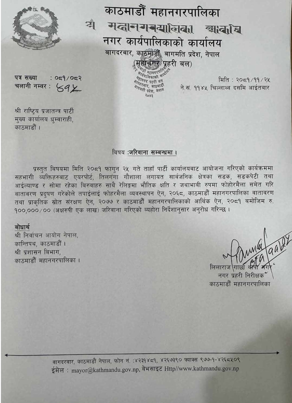 काठमाडौं महानगरपालिकाले राष्ट्रिय प्रजातन्त्र पार्टीलाई एक लाख रुपैयाँ जरिवाना तोकेको छ। सार्वजनिक क्षेत्रमा जथाभावी फोहोरमैला गरी वातावरण प्रदूषण गरेको भन्दै राप्रपालाई जरिवाना तोकेको हो ।