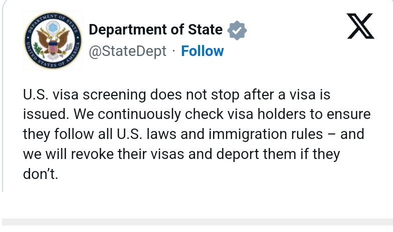 सोमबार अमेरिकी विदेश मन्त्रालयले सामाजिक सञ्जाल एक्समा पोस्ट गरेको एक सन्देशमा भिसा धारकहरूले अमेरिकी कानुन र आप्रवासन नियमहरू पालना गरेको सुनिश्चित गर्न निरन्तर जाँच गरिने र यदि उनीहरूले उल्लंघन गरेमा भिसा रद्द गरी देश निकाला गरिने उल्लेख छ। मन्त्रालयले आफ्नो आधिकारिक एक्स ह्यान्डलबाट जारी गरेको सन्देशमा भनिएको छ, ‘अमेरिकी भिसा स्क्रिनिङ भिसा जारी भएपछि रोकिँदैन। हामी भिसा धारकहरूले सबै अमेरिकी कानून र आप्रवासन नियमहरू पालना गरेको सुनिश्चित गर्न निरन्तर जाँच गर्छौं – र यदि उनीहरूले पालना नगरेको भेटिएमा हामी उनीहरूको भिसा रद्द गरी देश निकाला गर्नेछौं ।’