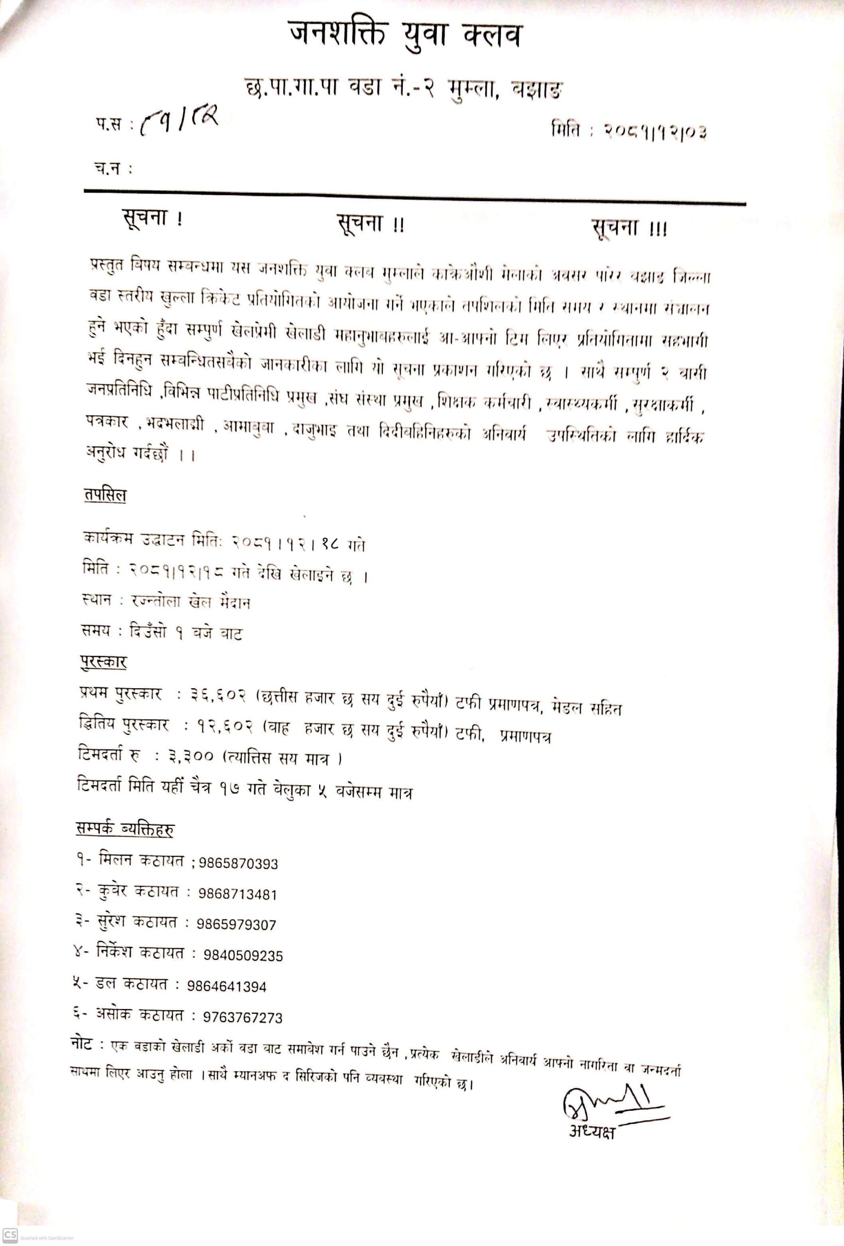 जिल्लाको छबिसपाथिभेरा गाउँपालिका-२ मुम्लामा रहेको जनशक्ति युवा क्लबले उक्त क्रिकेट प्रतियोगिताको आयोजना गर्न लागेको हो ।
