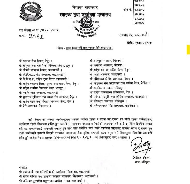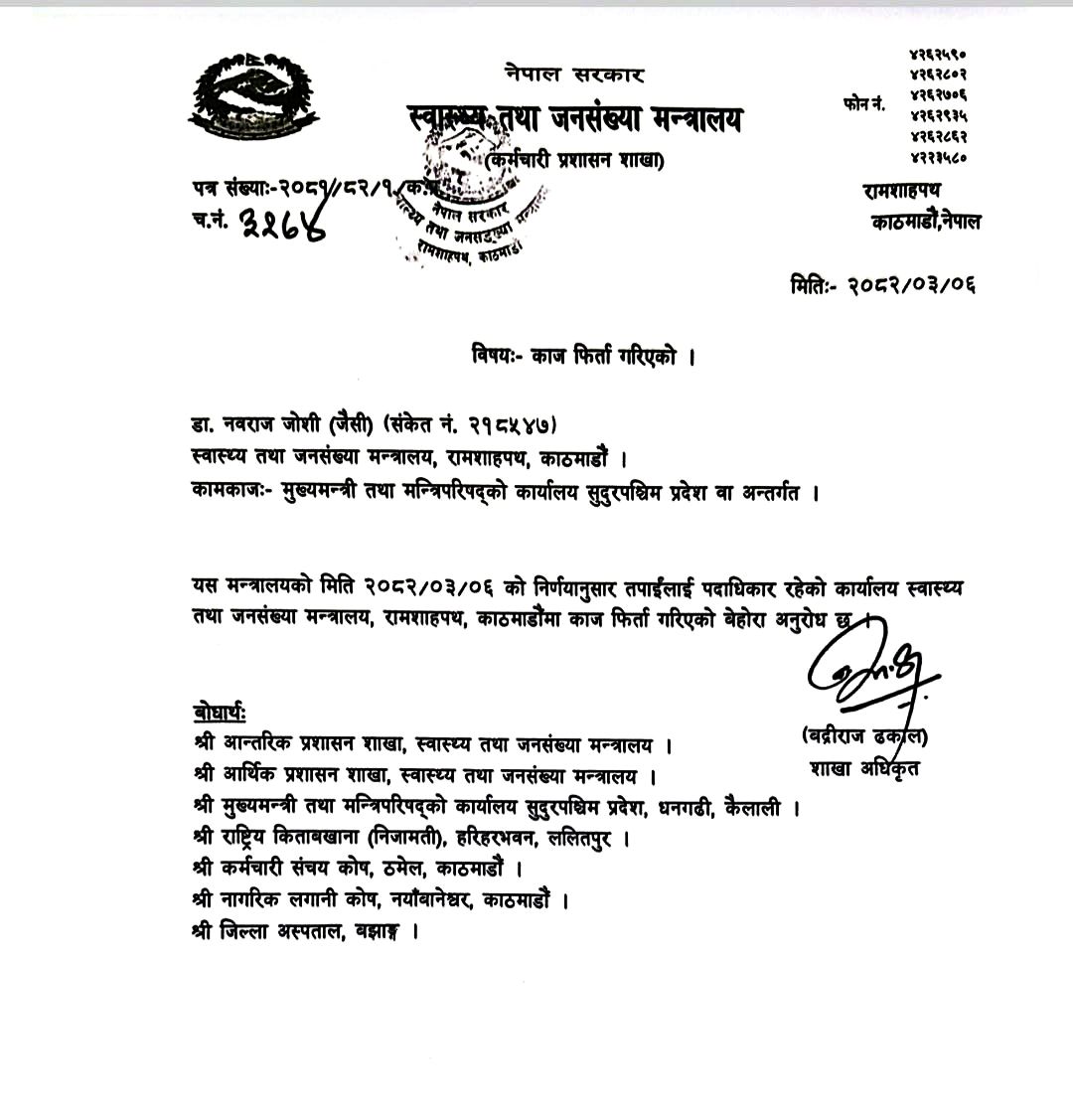 बझाङ: स्वास्थ्य तथा जनसंख्या मन्त्रालयले ६ दिनअघि डा. नवराज जोशी (संकेत नं. २१८५४७) लाई बझाङ जिल्ला अस्पतालबाट काज फिर्ता गर्दै सुदूरपश्चिम प्रदेश सरकार अन्तर्गतको कार्यस्थलमा पठाउने निर्णय गरेको थियो । मन्त्रालयको निर्णय अनुसार जारी चलानी नं. ३२७४, मिति २०८२/०२/०६ को आधिकारिक पत्रबमोजिम डा. जोशीले तत्कालै जिल्ला अस्पताल छोड्नुपर्ने थियो । तर, निर्णयको ६ दिन पुग्दासमेत डा. जोशी अस्पतालमै अडिएका छन्, जसले कर्मचारी आचरण र कानुनी व्यवस्थामाथि नै प्रश्न खडा गरिदिएको छ ।