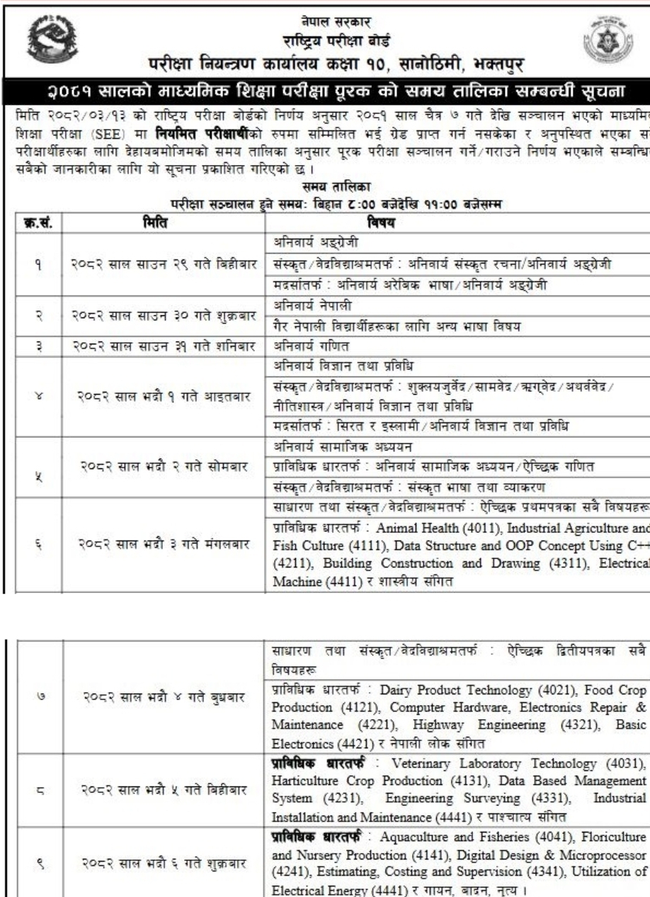 काठमाडौँ— एसईईको पूरक परीक्षा आउँदो साउन २९ गतेदेखि सुरु हुने भएको छ। पूरक परीक्षा भदौ ६ गतेसम्म बिहान ८ देखि ११ बजेसम्म सञ्चालन हुने राष्ट्रिय परीक्षा बोर्डले जनाएको छ।
