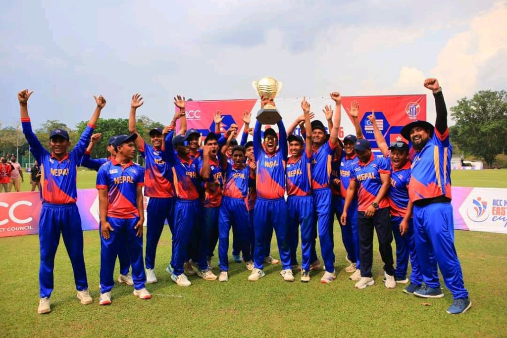 काठमाडौँ– नेपालले सिङ्गापुरलाई पराजित गर्दै एसीसी १६ वर्षमुनिको इस्ट जोन कप क्रिकेटको उपाधि जितेको छ। प्रतियोगिताभर अपराजित रहेको नेपालले फाइनलमा सिङ्गापुरले दिएको ११४ रनको लक्ष्य २९ ओभरमा ८ विकेट गुमाउँदै भेट्टायो।