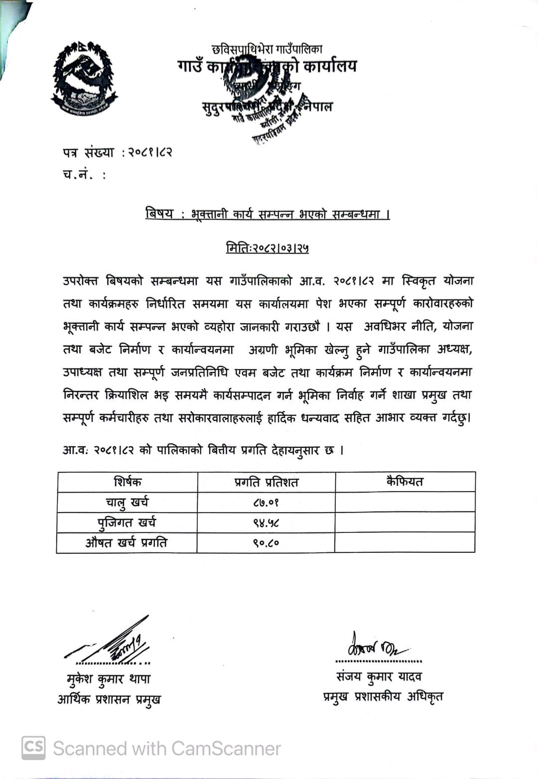 आर्थिक प्रशासन प्रमुख मुकेश कुमार थापा र प्रमुख प्रशासनिक अधिकृत संजय कुमार यादवले हस्ताक्षर गरेको उक्त सूचनामा जनप्रतिनिधि र कर्मचारीको समन्वयले लक्ष्यअनुसारको प्रगति गर्न सम्भव भएको उल्लेख छ ।