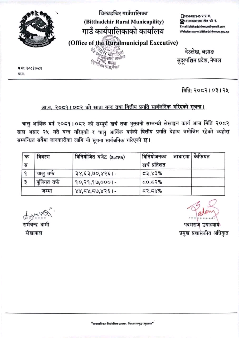 बझाङ- बझाङको बित्थडचिर गाउँपालिकाले आर्थिक वर्ष २०८१ । ०८२ को बजेट कार्यान्वयनको वित्तीय प्रगति विवरण सार्वजनिक गरेको छ । आर्थिक प्रशासन शाखा मार्फत बुधबार सार्वजनिक सूचना जारी गर्दै गाउँपालिकाले चालु तथा पुँजिगत शिर्षकमा गरिएको खर्च आम्दानी र कार्यान्वयनको प्रतिशतसहितको विस्तृत विवरण सार्वजनिक गरेको हो ।