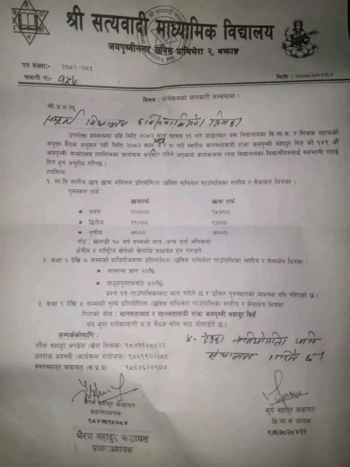 बझाङ- राजा जयपृथ्वी बहादुर सिंहको १४९औं जन्मजयन्तीको अवसरमा छविसपाथिभेरा गाउँपालिका–२ स्थित सत्यवादी माध्यमिक विद्यालय, जयपृथ्वीनगरले विशेष कार्यक्रमको आयोजना गर्ने भएको छ। भदौ ७ र ८ गते विद्यालय परिसरमै छविसपाथिभेरा गाउँपालिका स्तरीय भलिबल, हाजिरीजवाफ तथा नृत्य प्रतियोगिता सञ्चालन गरिने विद्यालय प्रशासनले जनाएको छ।
