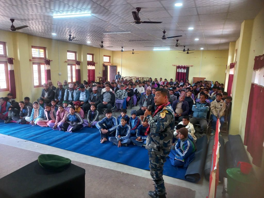 कार्यक्रममा सशस्त्र प्रहरी बल नेपाल, बझाङका डिएसपी दुर्गाप्रसाद भट्टले लागुऔषध दुर्व्यसनसम्बन्धी सचेतनामूलक कक्षा प्रदान गर्नु भएको थियो। उहाँले लागुऔषधका प्रकार, प्रयोगका कारण, यसले व्यक्ति, परिवार र समाजमा पार्ने नकारात्मक प्रभाव तथा यसबाट बच्ने उपायबारे विस्तृत रूपमा जानकारी गराउनु भएको थियो। साथै उहाँले विद्यार्थीहरूलाई अनुशासित जीवनशैली अपनाउन, खराब संगतबाट टाढा रहन र सकारात्मक सोचको विकास गर्न आग्रह गर्नु भएको हाे ।