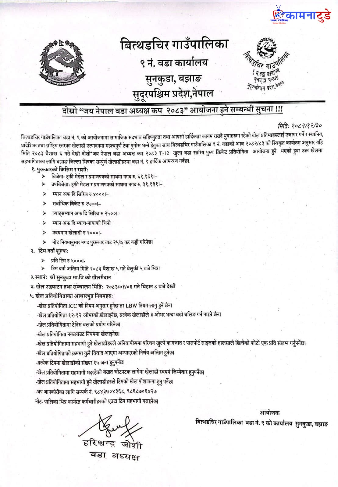 बझाङ- बझाङको बित्थडचिर गाउँपालिकामा `दोस्रो जय नेपाल´ वडाध्यक्ष कप २०८३ आयोजना हुनेभएको छ ।